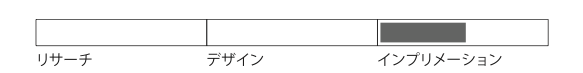 網掛けされている部分が、開発過程全体において、その章で説明するテクニックが使われる可能性が高い位置、もっとも重要な意味をもつ位置を示しています。たとえば、上の例は、インプリメンテーションの最初の段階で使われることが多いテクニックであることを示しています。しかし、多くのテクニックはデザイン過程のさまざまな場面で役に立つでしょう。この図は、あくまでも大まかな目安と考えてください。