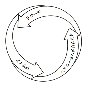 この図を見ると典型的な開発プロセスが直線的に進むかのように見えてしまいますが、一般にデザインの過程は「反復的」なものです。次の図のように、グルグルと回るもの、繰り返すものだと考えたほうがよいでしょう。