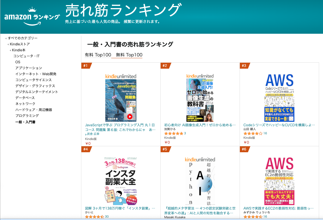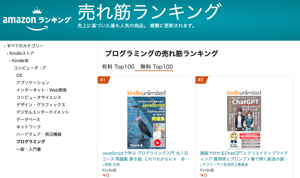Kindle版が「プログラミング」の売れ筋ランキング(無料 Top 100)で#1になりました。Kindle版全体では140位です(2024年5月21日)