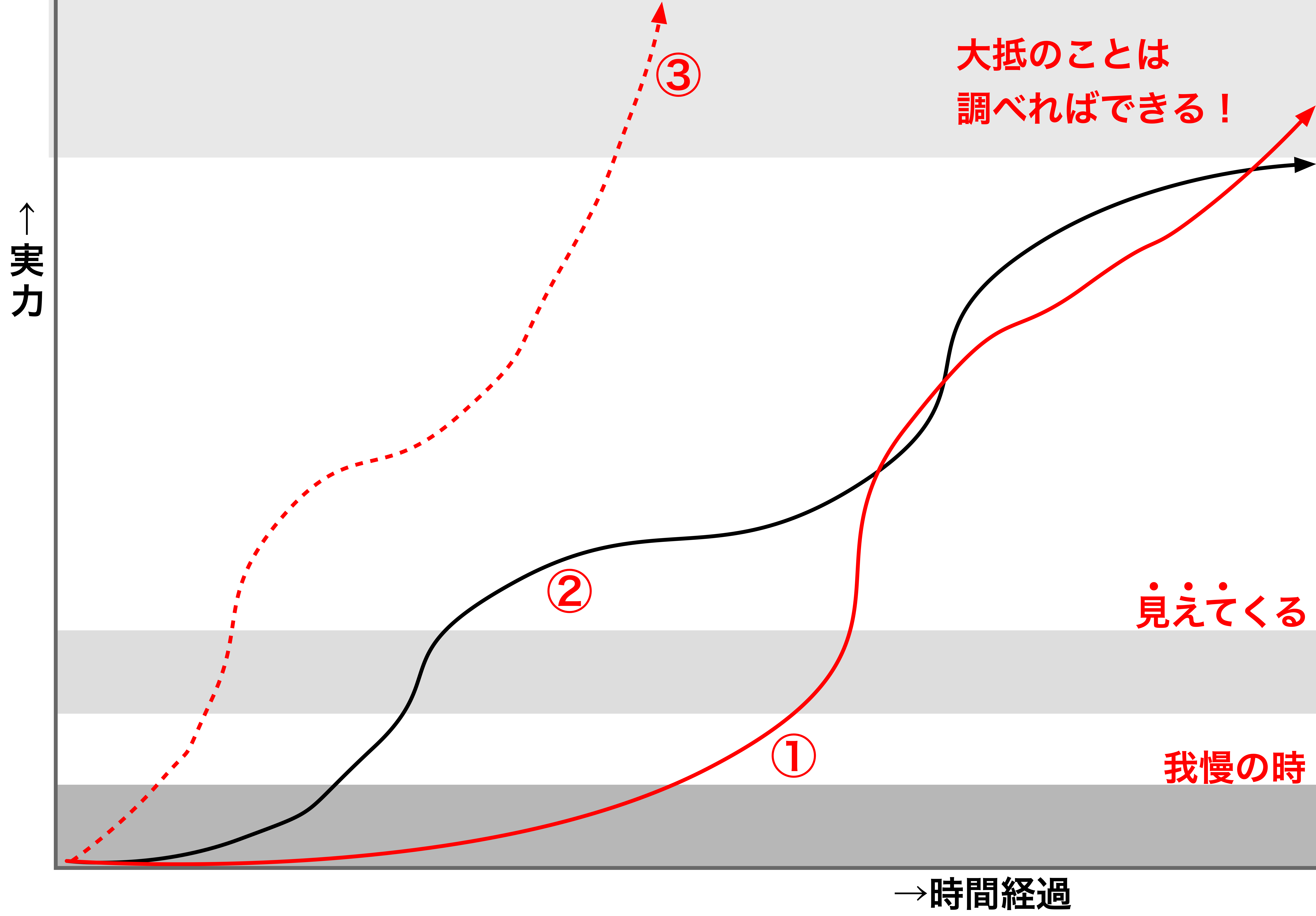 パターンは人それぞれです。朱の実線①のように最初はかなり苦労するが、あるところから急に実力がアップする人もいますし、出だしはまずまず順調に進み途中で伸び悩む黒い実線②のような人もいます。最初にくる「我慢の時」を乗り越えられるかどうかが、プログラミングを(ほぼ)不自由なくできるようになるか、楽しめようになるかどうかの分かれ目です。稀にですが、朱の破線③のように、ほとんど苦労せずに、見えるようになってしまう、「前世でもプログラミングをやっていたのではないか」と思わせるような方もいらっしゃいます*3。