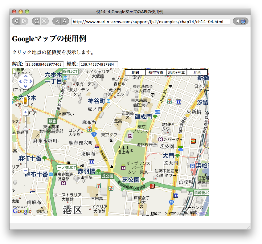 1刷 312 図14-3 図14-3をここをクリックして表示される画像に変更してください。 例14-4をAPIのバージョン3に対応させたのに伴い、地図の表示も変わりました。 10/27
