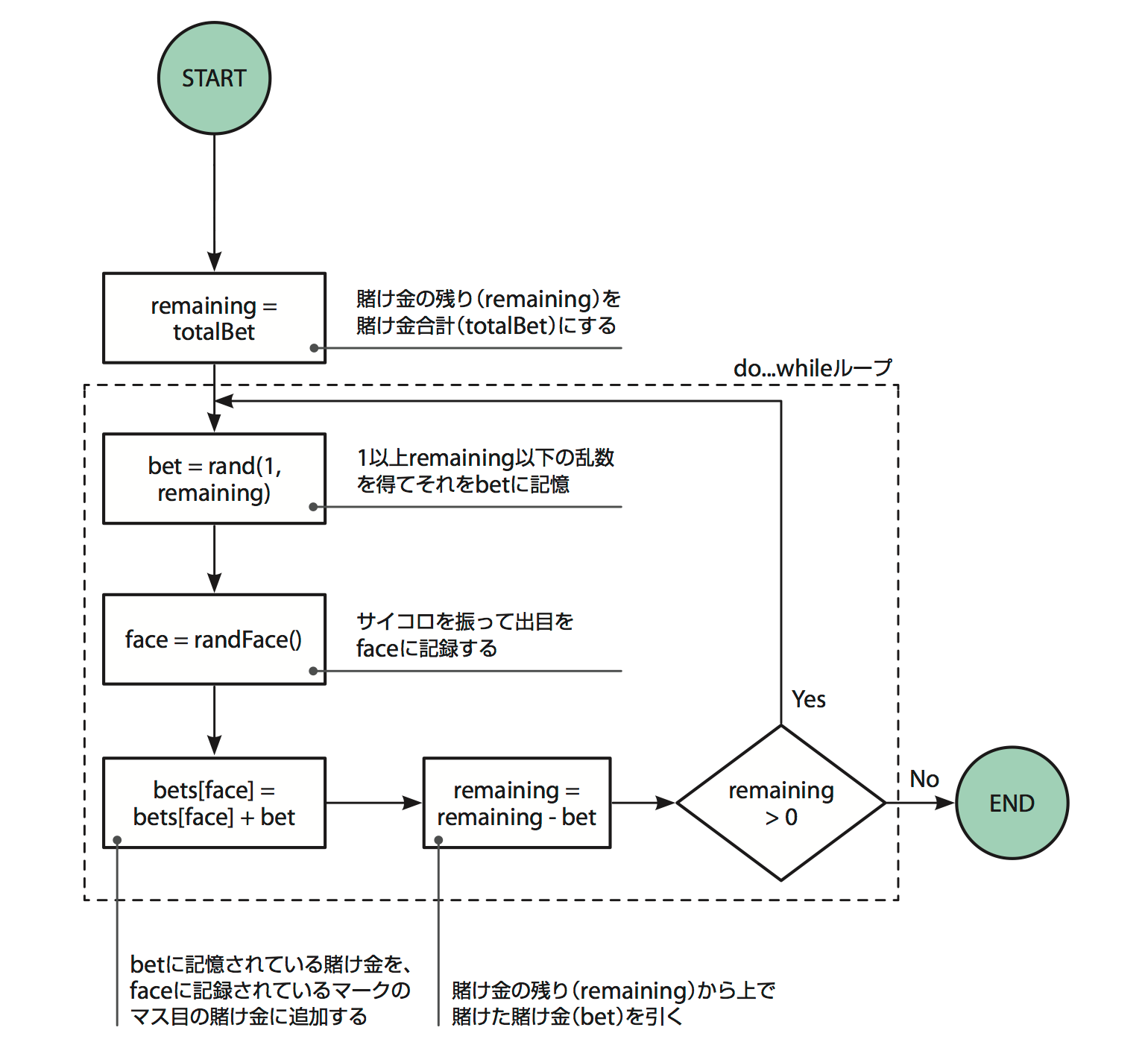 このリンク先の図のようにご訂正ください(do...whileループの範囲が大きすぎました。「remaining = totalBet」はループの範囲外です)