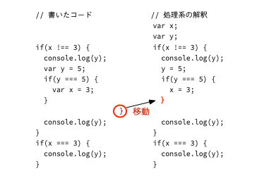 const x = 3; function f() { console.log(x); // 3 (これは動く) console.log(y); // ReferenceError: y is not defined (エラーになる) } f(); const y = 3;変数xは関数fが定義されるときに存在していますがyは存在していません。fの定義の下でyを宣言しfを呼び出しています。fが呼び出されたときその本体の中でxはスコープにありますが、yはスコープにはありません。これが静的スコープの例です。関数fは、それが定義されたときにスコープにある識別子にのみアクセスできます。関数f()が呼び出されたところでスコープにある識別子ではありません。