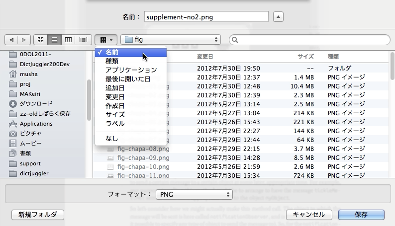 をクリックすると、名前や変更日などを基準に表示されるファイルのリストを並び替えることができます。たとえば、ここで[名前]を選択しておくと、現在選ばれているフォルダ内のファイルが名前の順に並びます。また、[変更日]を選択しておけば、最近変更したファイルをすぐに選択することができます。